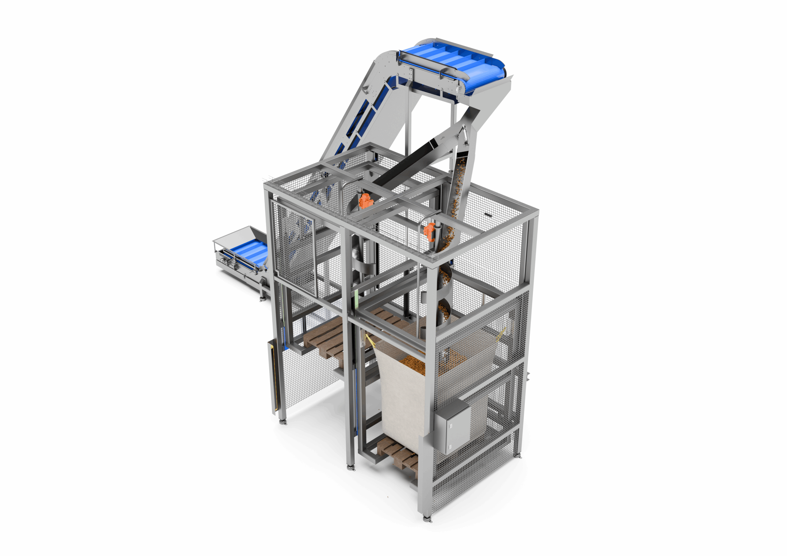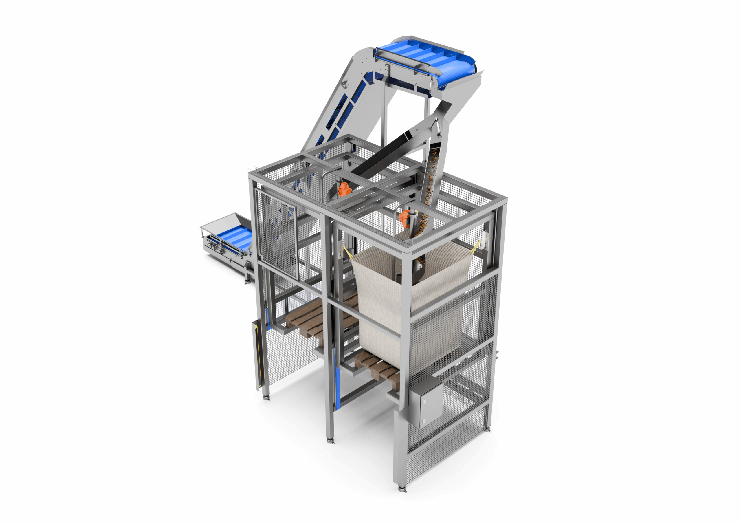 Se trata de una estructura con capacidad para 2 sacos, que recibe el producto desde el transporte anterior. Una compuerta distribuye automáticamente el producto hacia uno u otro lado, permitiendo llenar un saco mientras se prepara el otro, evitando así paradas innecesarias.